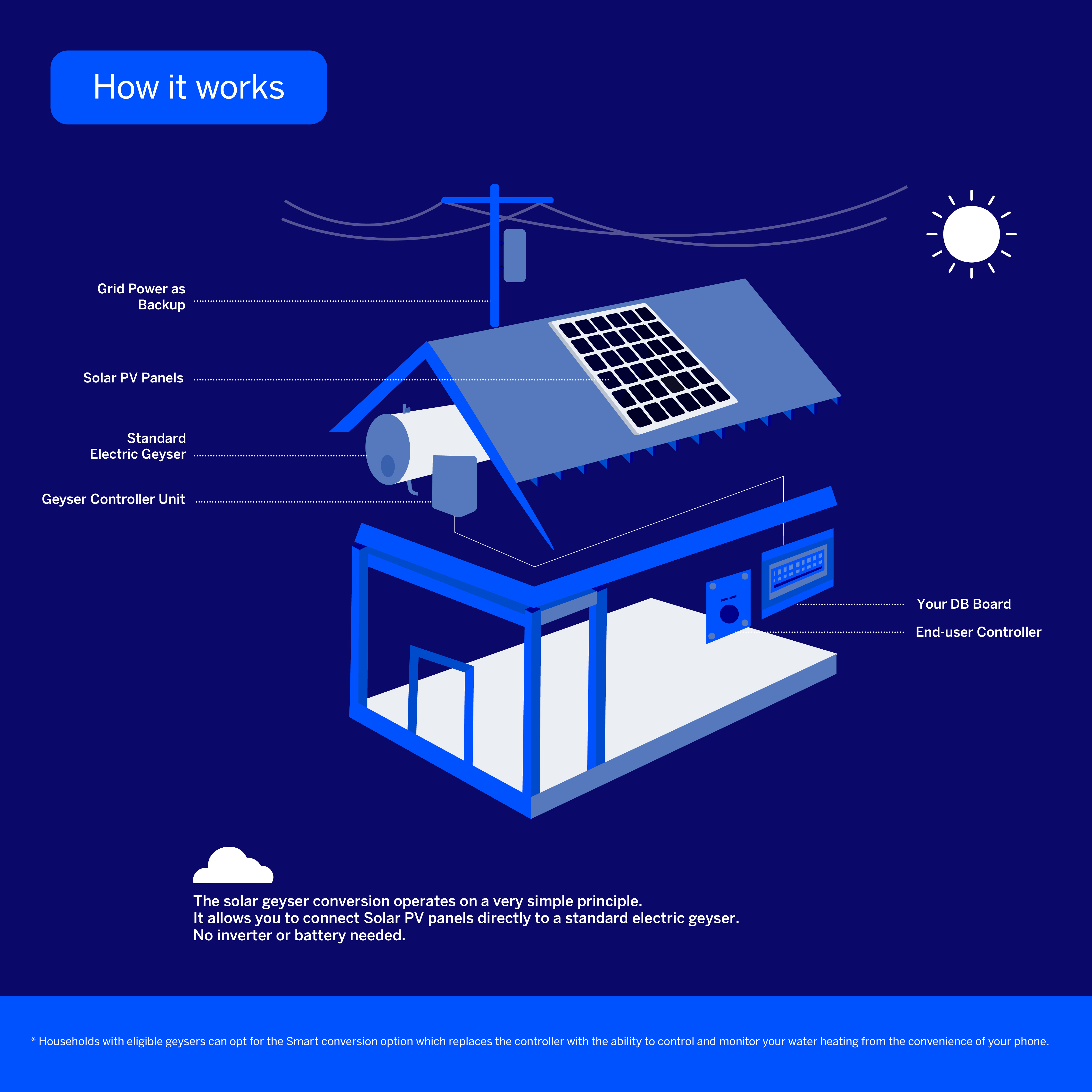 This innovative solution uses solar panels to power your existing geyser directly through a controller. You can also switch to mains electricity if it’s cloudy or when hot water demand is higher than usual.